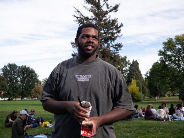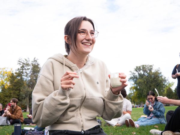 The majority of attendees of Pudding with a Fork expressed they were surprised at the turnout. Roughly 100 people attended overall, far surpassing organizer Ford’s initial estimation. A variety of genders, ages, and personal styles sat in an attentive circle upon City Park’s damp grass. Electric blue hair next to sensible brown, painted goths in leather boots knocking knees with blue jeans and graphic tee shirts. Before digging into pudding cups held aloft, the circle fell into a hush at the arrival of an honored attendee—the birthday girl, Deanna. The pudding circle chanted a happy birthday for Deanna, counted down from 3, then the feast commenced.